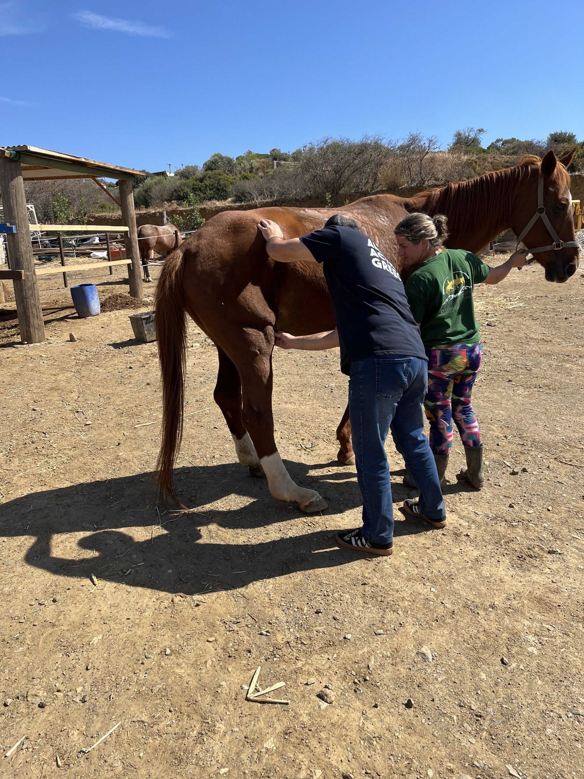 Δόθηκε φροντίδα σε δεκαπέντε άλογα, σε ένα μικρό ιππικό όμιλο, όπου φιλοξενούνται και ορισμένα διασωθέντα άλογα. Οι ιδιοκτήτες καταβάλλουν προσπάθεια να διατηρούν ένα καλό επίπεδο ευζωίας, ακολουθώντας πιστά τις συμβουλές της ομάδας. Ένα από τα άλογα με ιστορικό αγκίστρωσης της επιγονατίδας, παρουσίασε φέτος οιδήματα στα κάτω άκρα και συμπτώματα πιθανού καρδιολογικού προβλήματος. Οι ιδιοκτήτες ενημερώθηκαν σχετικά και έλαβαν οδηγίες να το αποσύρουν από την εργασία.