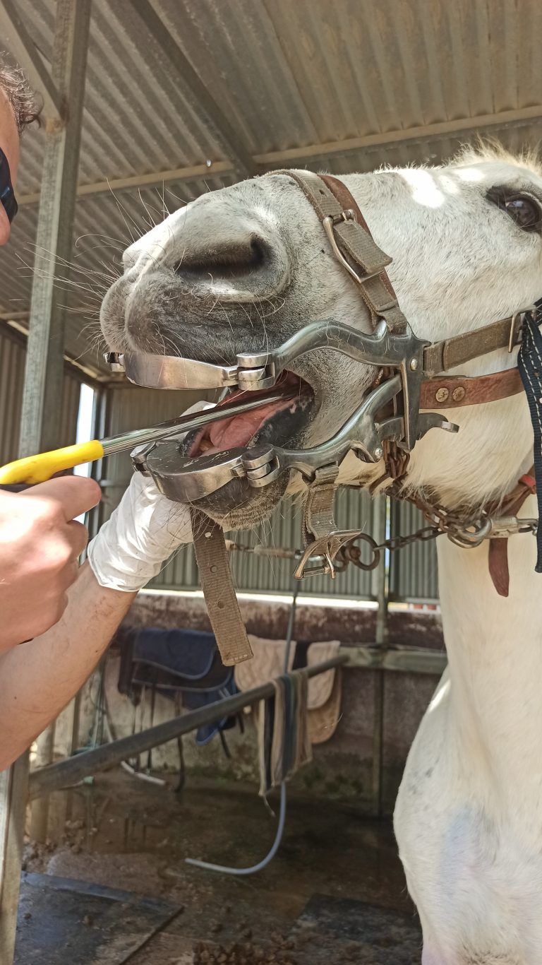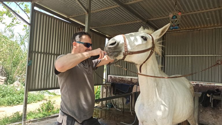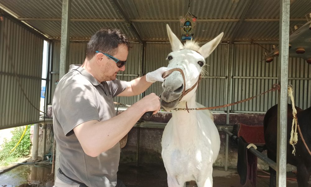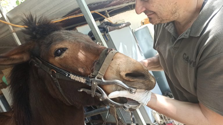 Alkis examined seven mules and one horse, performing necessary dental treatments. Most animals presented routine issues such as sharp enamel points, but also minor hooks, ramps, and a wave mouth were encountered, while calculus was removed from incisors and canines. Treatment by our Equine Care Programme is offered annually. Although none of the findings were critical for life, all required treatment to ensure the animals’ comfort and continued good health.