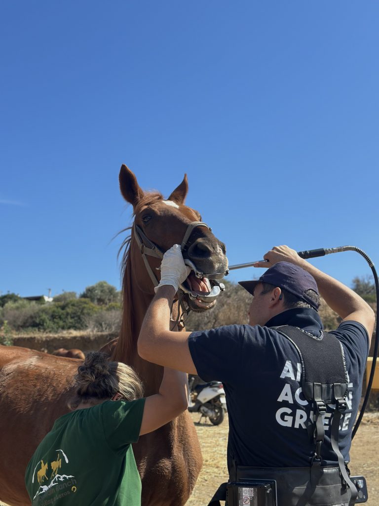On Lipsi the team once again met the couple who eagerly await their visit each year. 16 horses received their annual routine dental floating and hoof trimming. The Friesian gelding, which continues to receive veterinary care from the local veterinarian, was re-examined during this visit. As previously advised, radiographs would ideally be required to determine the underlying cause of the recurring abscess in its mouth. However, due to the remoteness of the area and the high cost, this remains unfeasible at present. Nevertheless, the team’s equine dental technician performed dental floating to remove sharp edges, a procedure that has consistently improved the horse’s comfort while chewing and led to the disappearance of the pus for several months before it reappears.